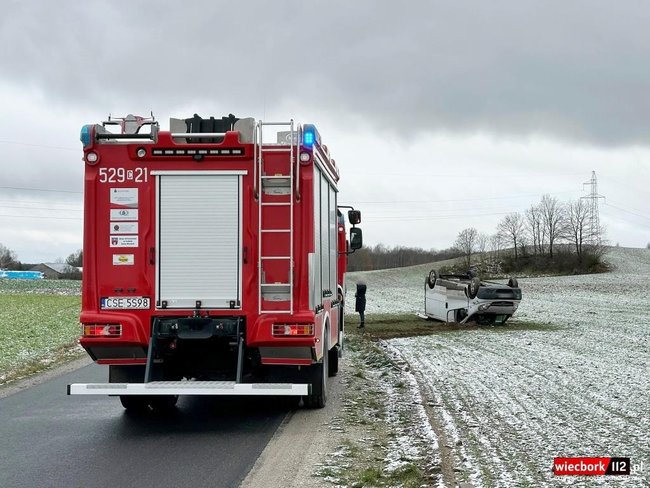 Na miejsce zadysponowano zastęp z Jednostki Ratowniczo-Gaśniczej w Sępólnie Krajeńskim oraz zastęp z Ochotniczej Straży Pożarnej w Więcborku. Na miejscu okazało się, że na drodze gminnej nr. 02017C samochód typu bus z niewyjaśnionych przyczyn wypadł z drogi i dachował. Na szczęście w zdarzeniu nikomu nic się nie stało.