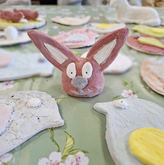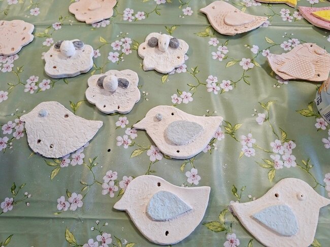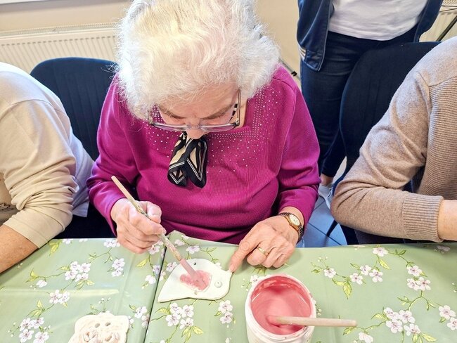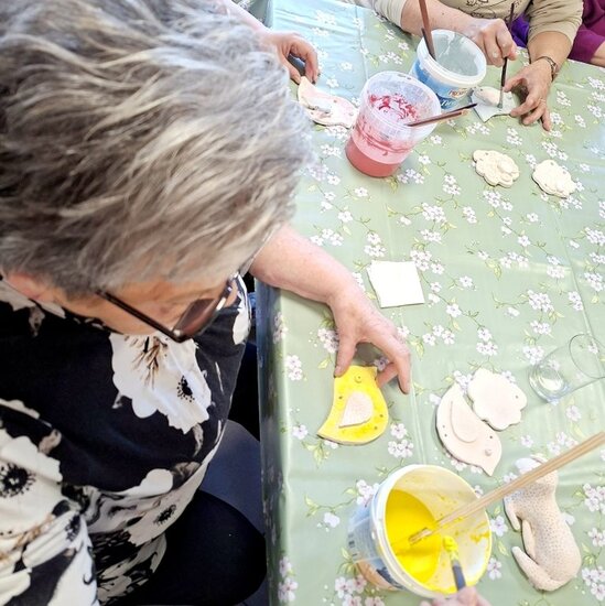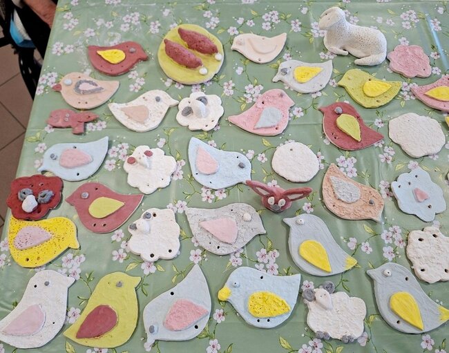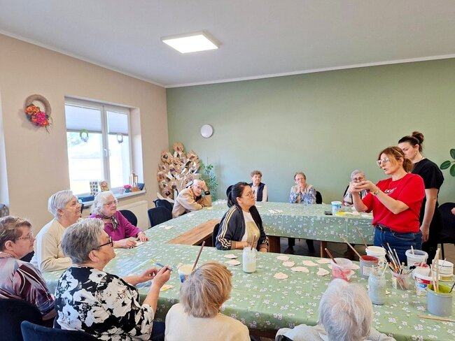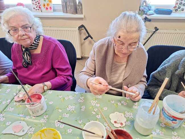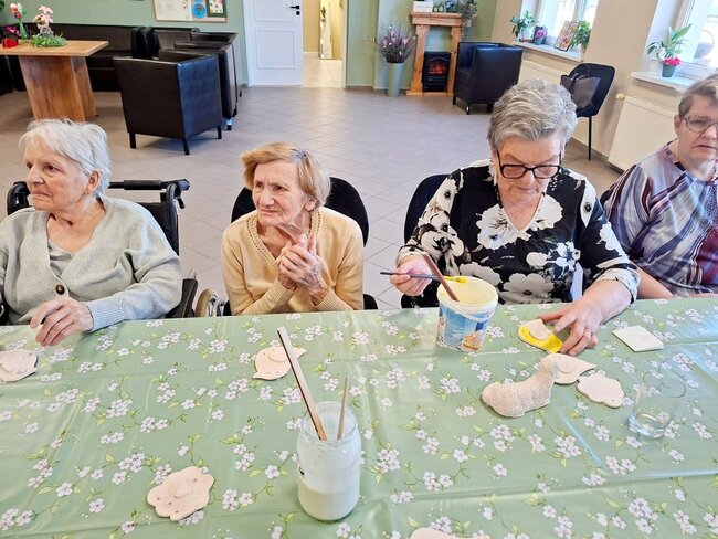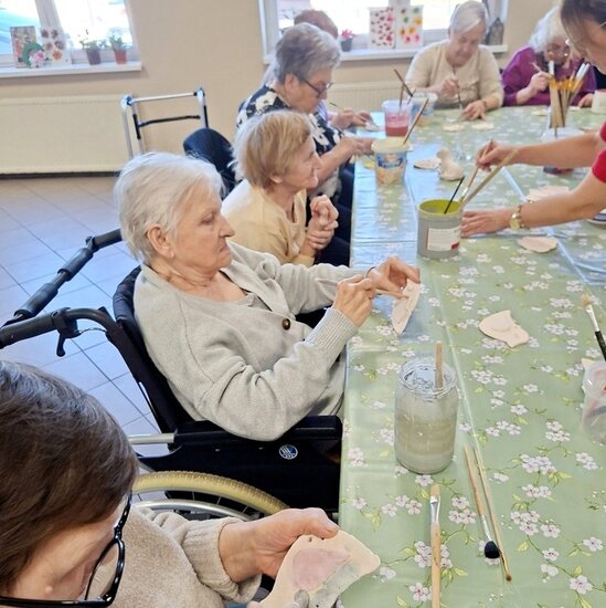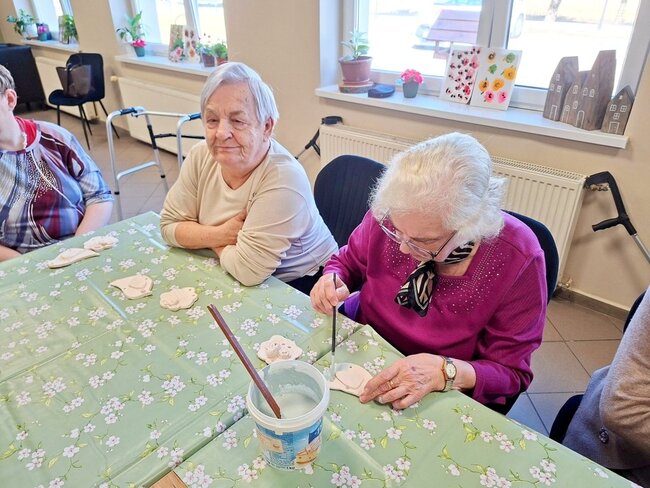 Podczas poprzednich zajęć seniorzy  z ogromnym zaangażowaniem i kreatywnością lepili swoje prace z gliny. Powstały wtedy piękne ptaszki, aniołki, serduszka oraz baranki. Po pierwszym wypale na biskwit przyszedł czas na nadanie im kolorów i charakteru. Po krótkim instruktażu każdy z ogromną dokładnością malował swoje prace. Ten etap zawsze budzi wiele emocji i ciekawości, ponieważ dopiero po kolejnym wypale zobaczymy prawdziwy efekt .