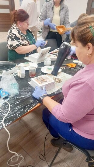 Podczas zajęć seniorki tworzyły skrzyneczki na skarby, wykorzystując motyw dzieci w zimowym klimacie. Tematyka prac oczywiście nawiązywała do zbliżających się Dni Babci i Dziadka, przywołując miłe skojarzenia, wspomnienia oraz rodzinne emocje.