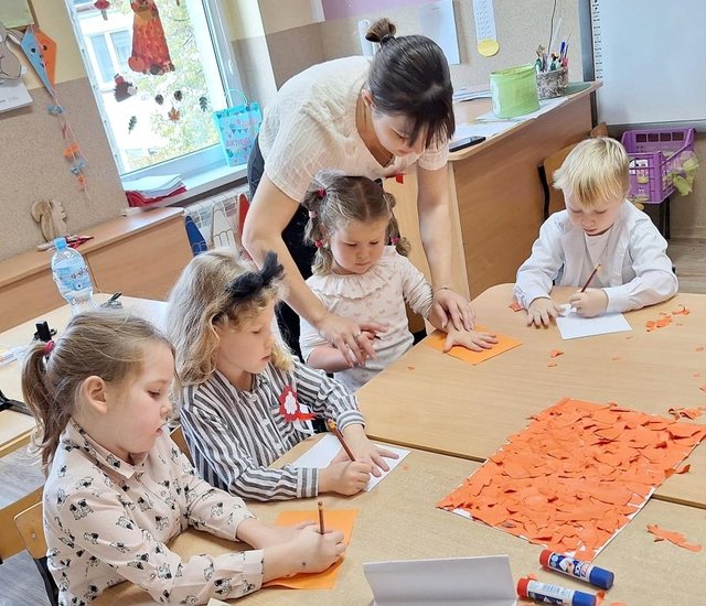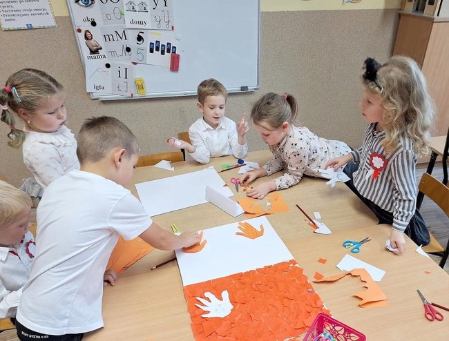 Dzieci darły białe i czerwone kartki na małe kawałki. Następnie wspólnie wykleiły flagę Polski. Na kartkach odrysowały także swoje dłonie i symbolicznie nakleiły je na gotową flagę. W ten sposób pokazały, że także i one budują nasza Ojczyznę.