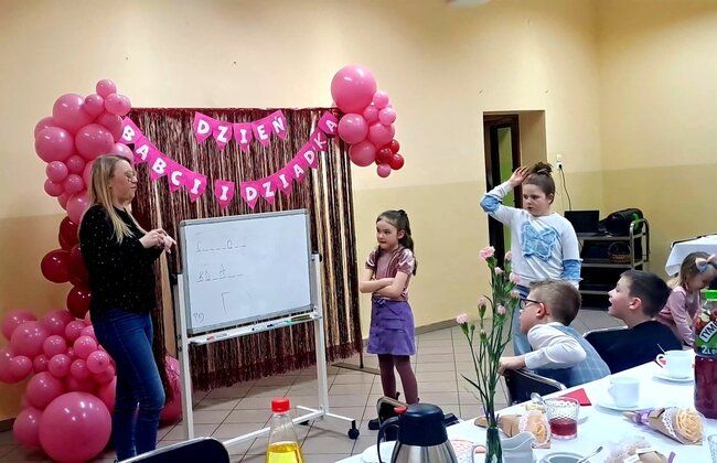 Nie mogło zabraknąć również zabaw ruchowych oraz gimnastyki umysłów! Najpierw był wyścig z jajkiem na łyżce, który rozruszał naszych gości. Następnie odbyły się quizy, z pytaniami o przeszłość Dziadków, pogadanki np. o wyrazach, które wyszły już z użycia a na koniec przeprowadzona była emocjonująca gra w "wisielca". Atrakcje dostarczyły mnóstwa śmiechu i radości wszystkim uczestnikom.