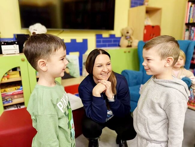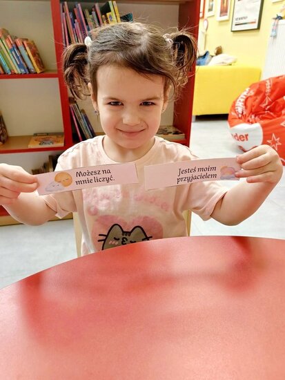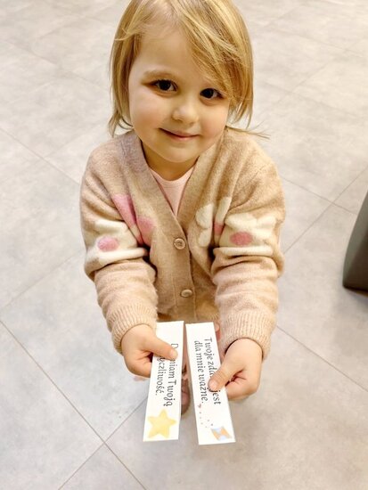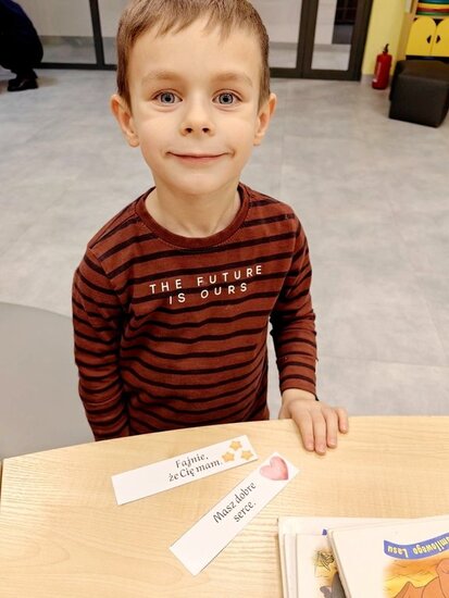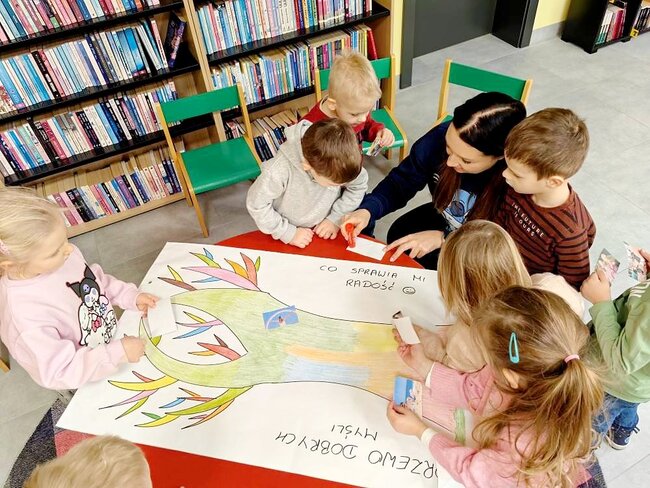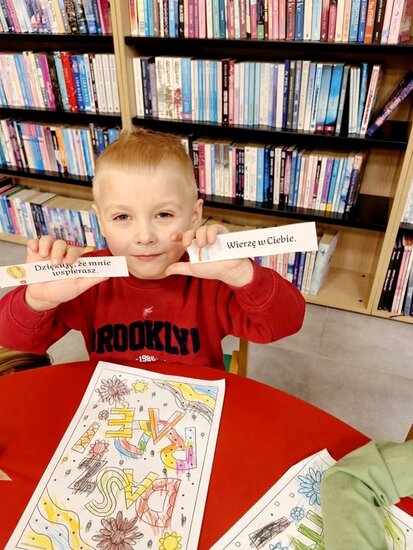 Rozmawialiśmy o zaletach pozytywnego myślenia oraz optymistycznego spojrzenia na każdy dzień. Dzieci wysłuchały bajeczki o trzech małych sówkach, które postanowiły poszukać Krainy Radości, przesyłały sobie iskierkę dobroci, mówiły co im sprawia radość. Małe Sówki wykonały też taniec radości, bawiły się w lustrzane odbicie, przystroiły drzewo dobrych myśli oraz wybrały dla bliskich karteczki z dobrym słowem. Na zakończenie dzieci otrzymały zakładki, z ważnym przesłaniem: „Ciesz się z drobnych rzeczy”. To było spotkanie pełne uśmiechu.