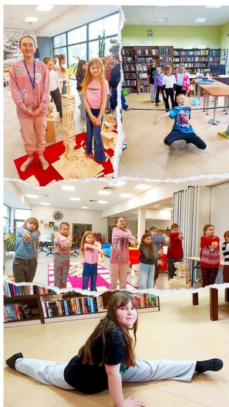 Rozpoczęliśmy od zajęć integracyjnych, które pozwalały uczestnikom lepiej się poznać. Dzieci brały udział w grach zespołowych, wyzwaniach sprawnościowych oraz ćwiczeniach ruchowych. Feriowicze mogli również rozwijać swoje talenty plastyczne. Dużo emocji wzbudziły konkurencje sportowe i taneczne. W czwartek udaliśmy się do biblioteki dziecięcej w Nakle aby wziąć udział w warsztatach przygotowanych przez animatorów z „Cudosfery” z drewnianymi klockami w roli głównej. W programie znalazł się także konkurs „Mam talent”, w trakcie którego młodzi artyści z dumą prezentowali swoje zdolności. Był taniec, śpiew i sportowe popisy. Wszyscy chętnie angażowali się w proponowane aktywności wykazując się energią, kreatywnością i świetna współpracą. Ferie pokazały, że biblioteka może być przestrzenią pełną ruchu, radości i integracji.