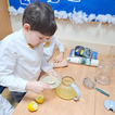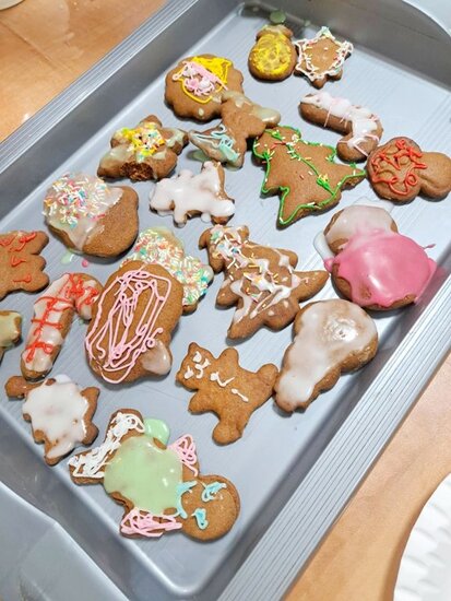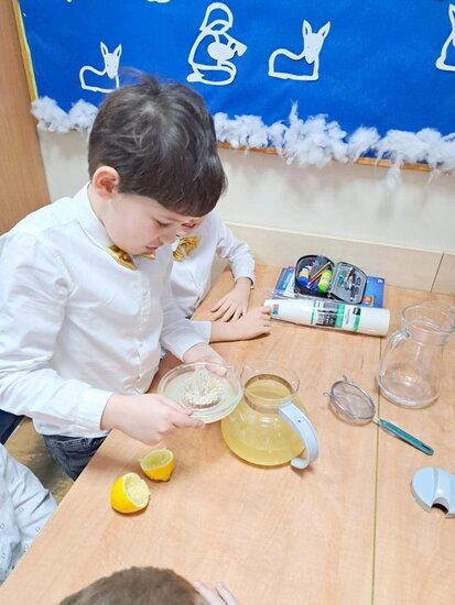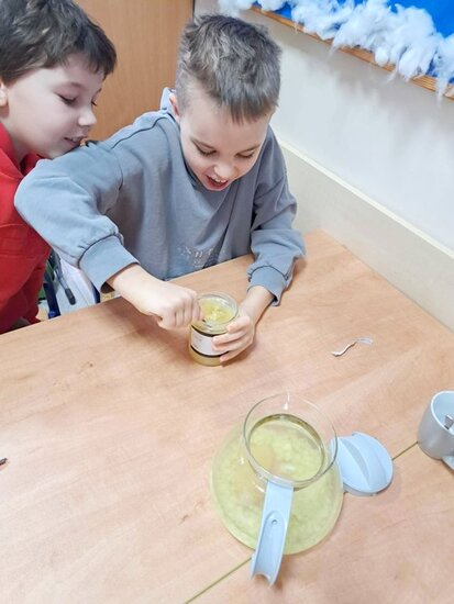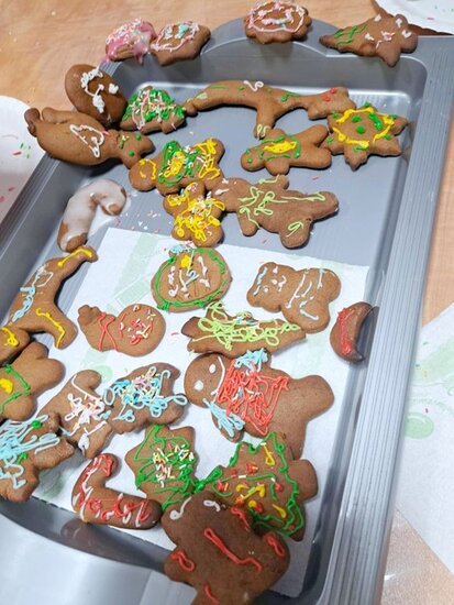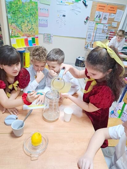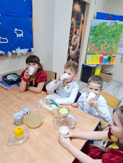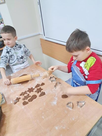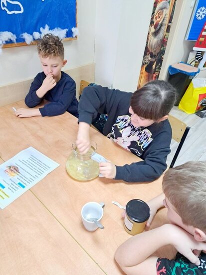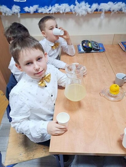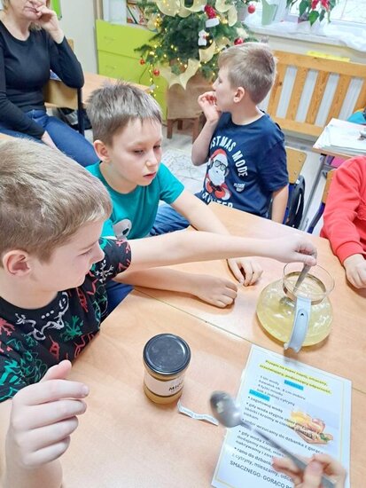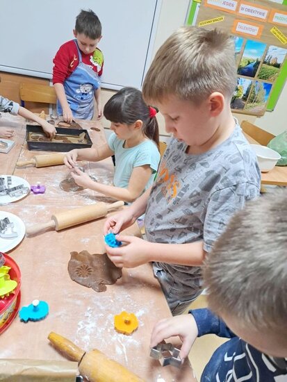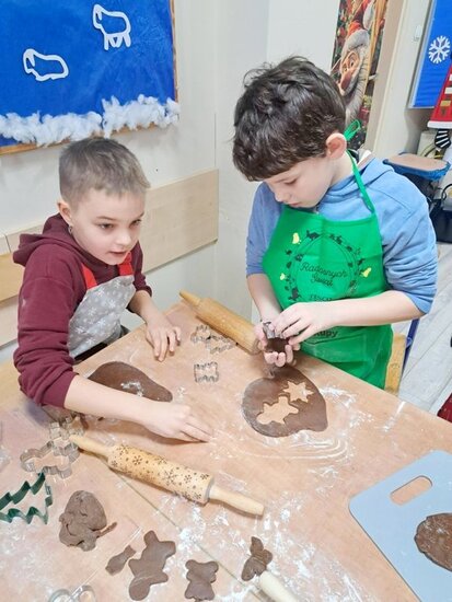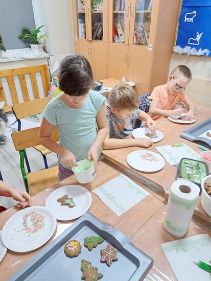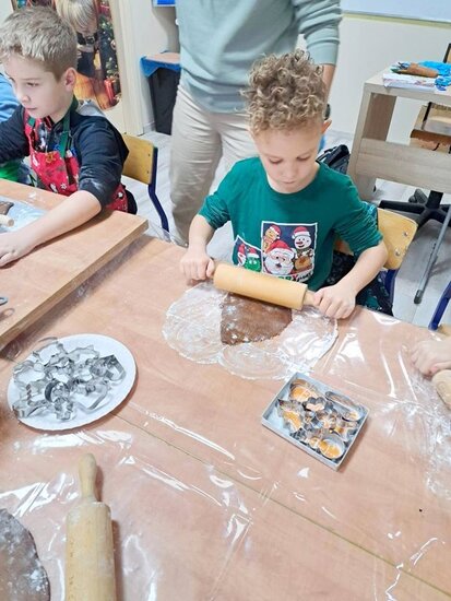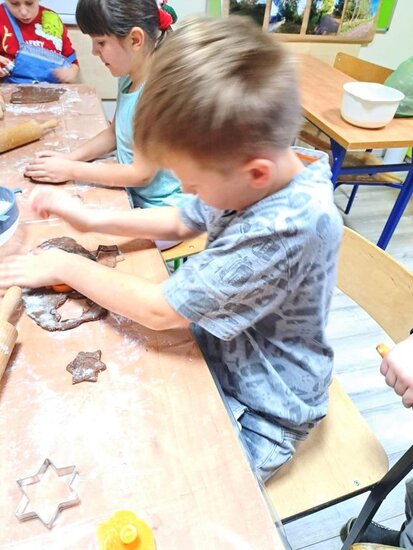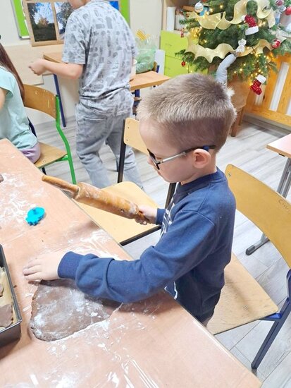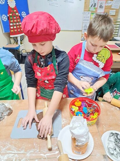 Nie zabrakło także wspólnego pieczenia pierników – dzieci z radością wykrawały ciasteczka, a po upieczeniu ozdabiały je kolorowym lukrem i posypką. Podczas warsztatów kulinarnych uczniowie samodzielnie przygotowali również napój imbirowy, poznając tajniki łączenia imbiru, miodu, cytryny i wody. Każdy mógł spróbować własnoręcznie przygotowanego napoju – była to doskonała lekcja zdrowych nawyków i samodzielności.