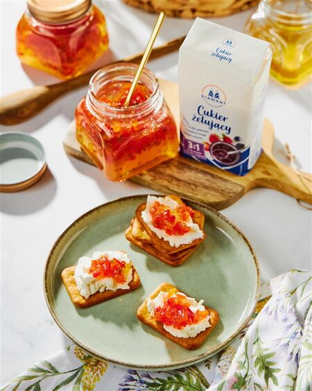 W tej recepturze kluczową rolę odgrywa Cukier Żelujący Diamant 3:1, który skraca czas gotowania i pozwala zachować intensywną barwę oraz aromat papryki. Dzięki niemu galaretka szybko uzyskuje właściwą konsystencję, a kontrast słodyczy i ostrości staje się wyjątkowo wyraźny.