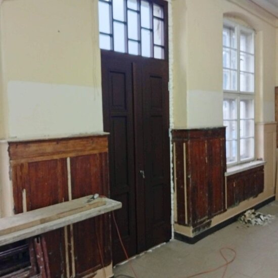 Efekt jest bardzo ładny zniknęły niepasujące plastikowe okna i stare wysłużone drzwi. Ta sytuacja przyśpieszyła zaplanowany remont pozostałych pomieszczeń w siedzibie Towarzystwa Historycznego. Jesteśmy w trakcie oczyszczania pozostałych elementów boazerii w holu zejścia na perony, czeka nas przebudowa instalacji elektrycznej w tym pomieszczeniu i w części byłej restauracji kolejowej, wzmocnienie ścian i malowanie.