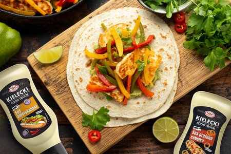 To danie, które łączy prostotę z nowoczesnością, a jego smak można dowolnie modelować. Wszystko zależy od wybranego sosu z oferty WSP „Społem”. W wersji z Sosem Kieleckim amerykańskim tortilla nabiera wyrazistego, lekko pikantnego charakteru. Dodatek – inspirowany kuchnią zza oceanu – idealnie współgra z grillowanym serem, papryką i cukinią. Nadaje potrawie lekko „fastfoodowego” sznytu, ale w domowej, zdrowszej odsłonie. Z kolei Sos Kielecki prażona cebulka wprowadza nutę słodyczy i przyjemnej kremowości. W połączeniu z warzywami z grilla i delikatnym halloumi tworzy zestawienie, które przypadnie do gustu fanom łagodniejszych, ale wciąż wyrazistych smaków.