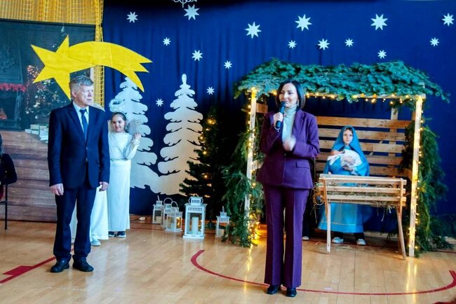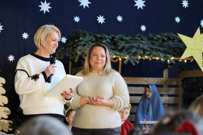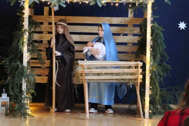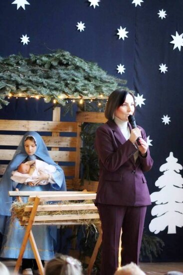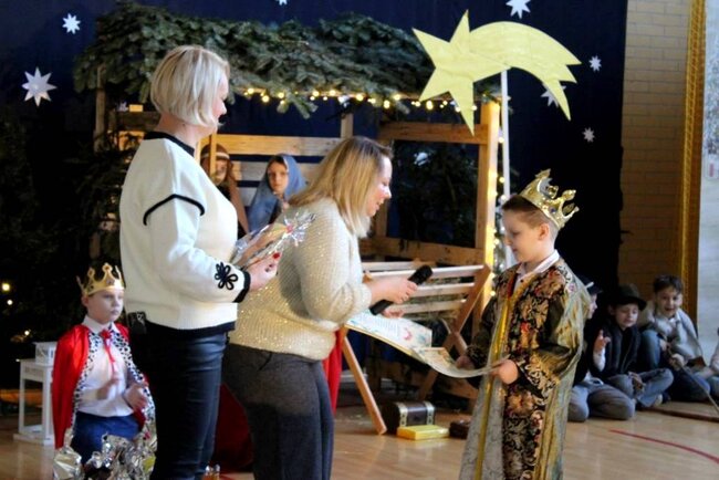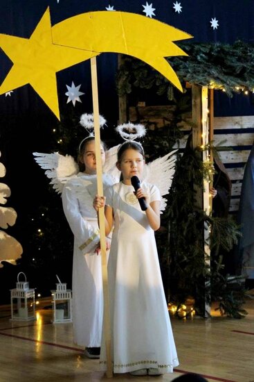 Po zakończeniu przedstawienia Pani Dyrektor Ewelina Marczak złożyła wszystkim serdeczne, świąteczne życzenia, dziękując jednocześnie uczniom i nauczycielom za wspaniałe przygotowanie wydarzenia. Szczególną uwagę przykuwała piękna scenografia- dzieło Pana Andrzeja Wesoła, Ewy i Krzysztofa Cichońskich. Nastrojowe oświetlenie, mały Jezusek leżący w prostym, drewnianym żłobie, obok Maryja i Józef, otoczeni zwierzętami. Ten obraz wywołał wzruszenie widowni.
