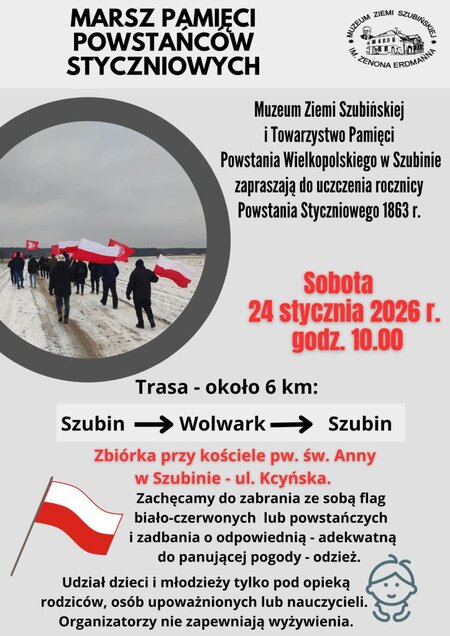 6 kilometrowy marsz odbędzie się w sobotę 24 stycznia 2026 r. na trasie Szubin - Wolwark - Szubin. Zbiórka o godz. 10.00 przy kościele pw. św. Anny - ul. Kcyńskiej w Szubinie. Warto zadbać o odpowiedni ubiór. Zachęcamy, by zabrać ze sobą biało-czerwone lub powstańcze flagi. Dzieci mile widziana - tylko pod opieką dorosłych lub opiekunów.