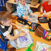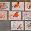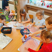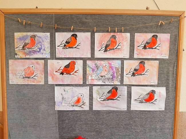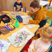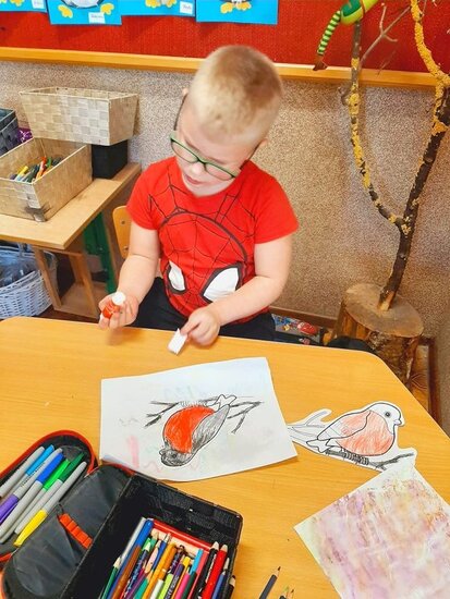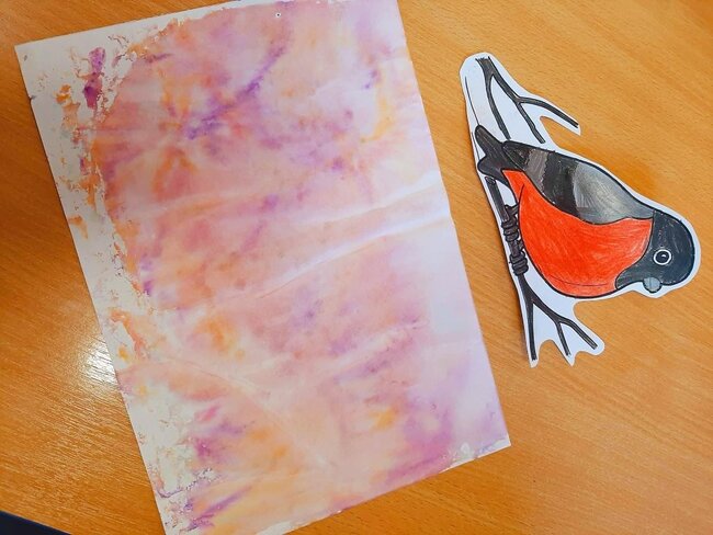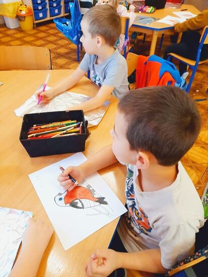 Dzieci rysowały kolorowymi flamastrami na folii, a następnie spryskują wodą, tworzyły rozmyte plamy, które odbijały na białej kartce papieru i ptaszek gotowy.