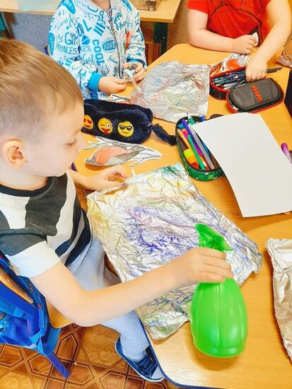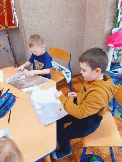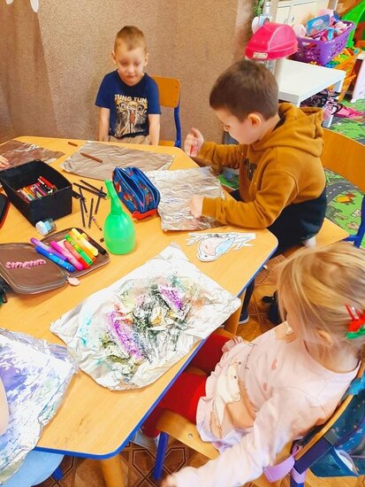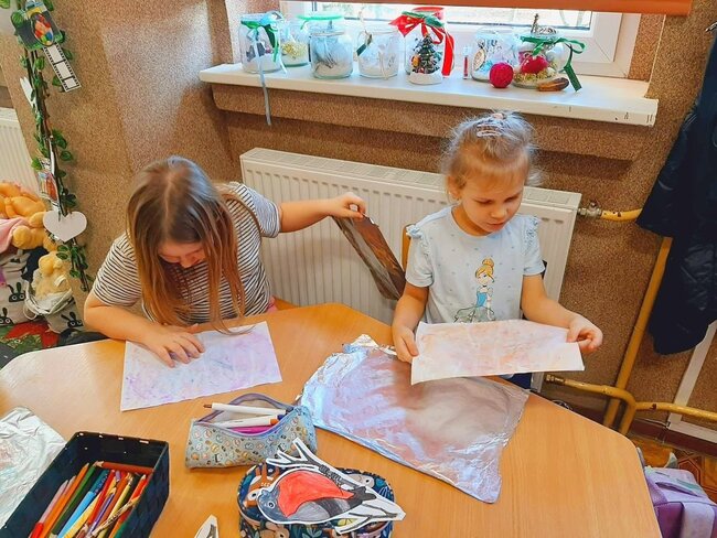 Zajęcia plastyczne w grupie przedszkolnej# Szkoły Podstawowej im. bł. Marii Karłowskiej w Chwaliszewie z wykorzystaniem folii aluminiowej, pisaków i wody.