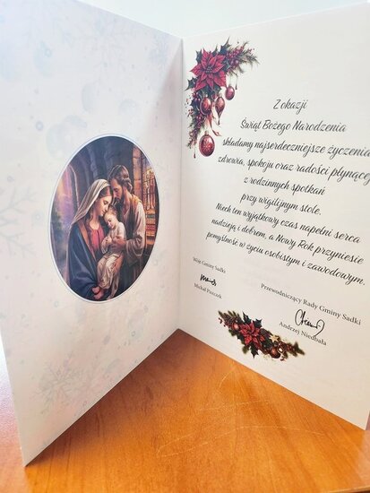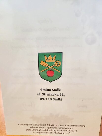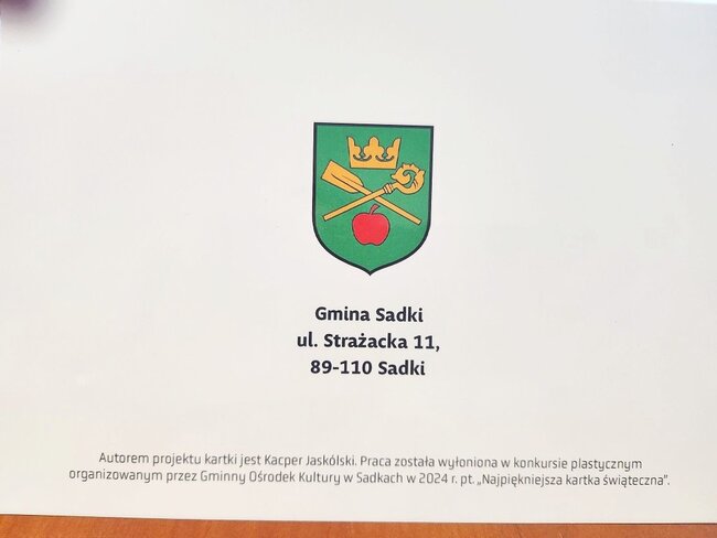 Dodatkową nagrodą dla uczestników konkursu jest możliwość profesjonalnego druku ich projektów. Spośród kartek z roku 2024 wybraliśmy dwie, które posłużyły jako tegoroczny projekt kartek świątecznych dla Urzędu Gminy w Sadkach. Autorami tych prac są Kacper Jaskólski i Zofia Orzech.