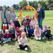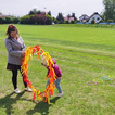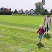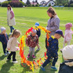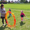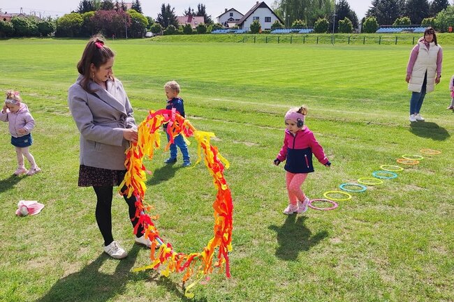 Potem przenieśliśmy się na boisko sportowe, na którym przygotowaliśmy specjalnie na tę okazję tor przeszkód. Dzieci mogły spróbować swoich sił w omijaniu ognia skakając do obręczy, przeskakiwaniu przez ogień i celowaniu piłeczkami do kubeczków.