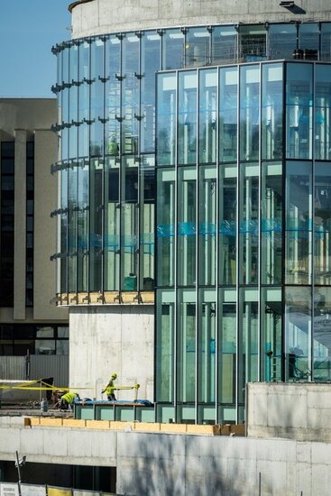 Obecnie trwają intensywne prace wykończeniowe i instalacyjne w obu powstających obiektach, w tym roboty tynkarskie, wykonywanie posadzek, montaż instalacji wentylacyjnej i oświetleniowej oraz okablowania, a także dostawy płyt i okładzin do zamontowania na elewacji części parkingowej.