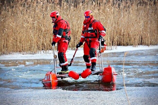 Praca na lodzie: Strażacy co kilka metrów wycinają otwory w pokrywie lodowej przy użyciu pił spalinowych. Dzięki temu nasi ratownicy mogą wprowadzać sonary i dokładnie przeszukiwać dno rzeki.