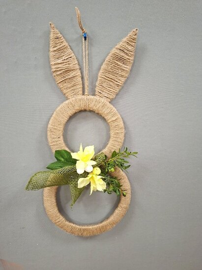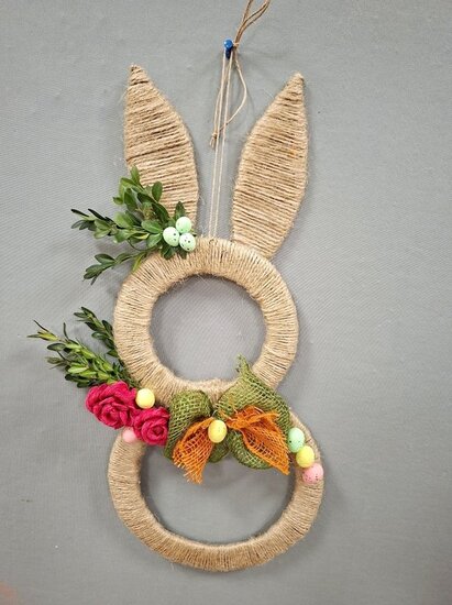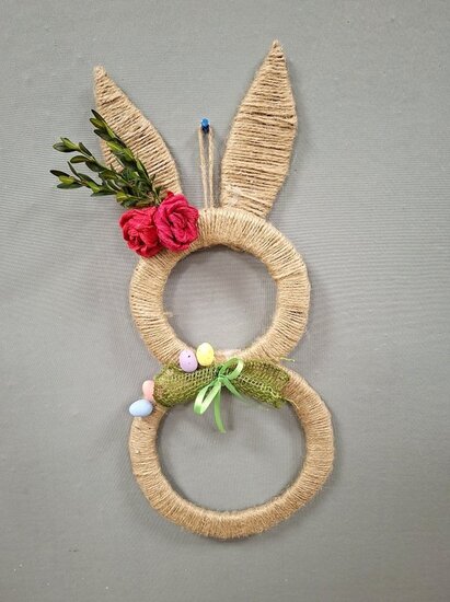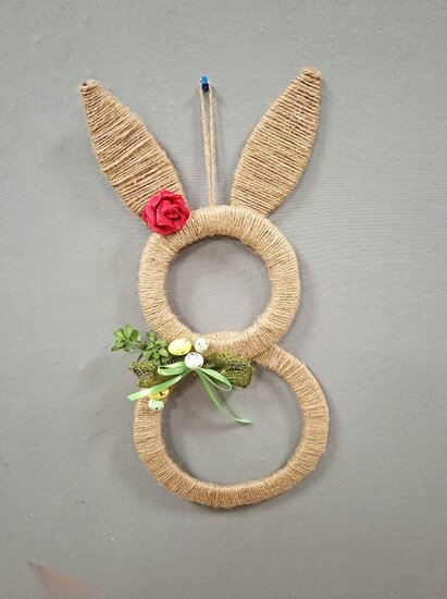 Z tektury i sznurka jutowego powstały wyjątkowe zawieszki w kształcie zajączka. Uczestnicy ozdabiali je kwiatkami, które samodzielnie wykonali z krepiny. Kokardy z juty ,wstążki oraz kolorowe jajeczka pięknie dopełniły nasze prace.