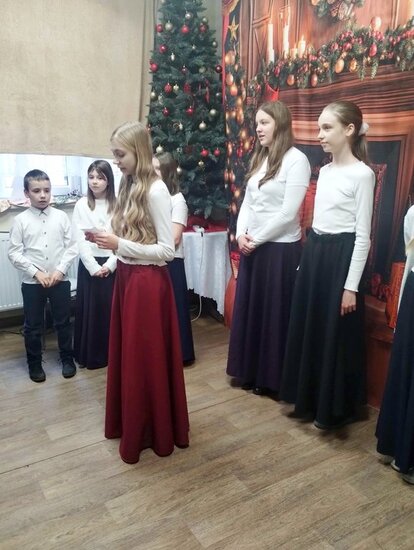 Uczniowie zaprezentowali piękne kolędy i pastorałki przy akompaniamencie, umilając czas naszym seniorom. Wspólne śpiewanie wprowadziło radosną, świąteczną atmosferę i wywołało wiele uśmiechów.