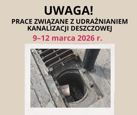 W dniach 9-12 marca# 2026 r. prowadzone będą prace związane z udrażnianiem kanalizacji deszczowej.