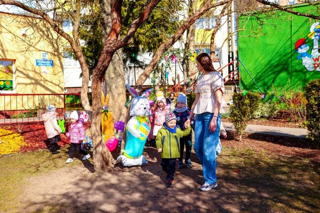 Jednak najwięcej emocji wzbudziła wizyta Zajączka Wielkanocnego, który ukrył dla dzieci prezenty w ogrodzie przedszkolnym. Przedszkolaki z wielkim entuzjazmem wyruszyły na ich poszukiwanie, a odnalezione upominki sprawiły im ogromną radość. Był to dzień pełen uśmiechu, zabawy i niezapomnianych chwil.