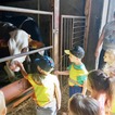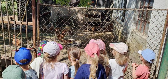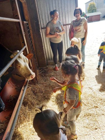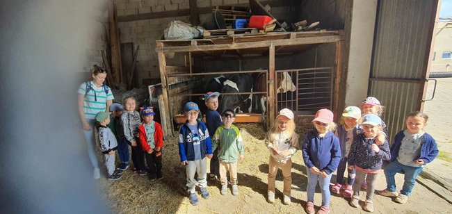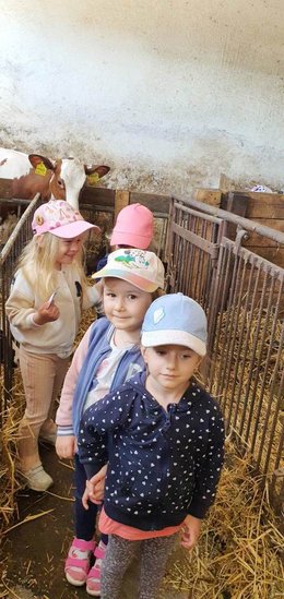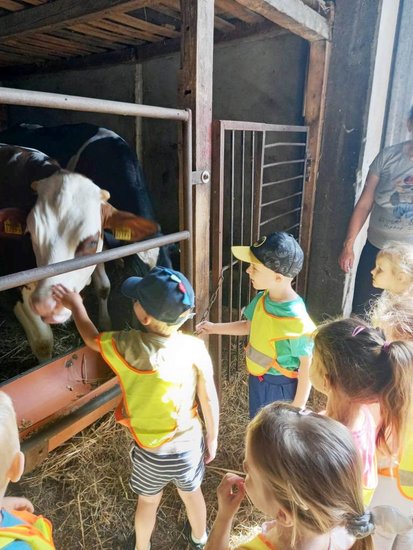 Dzięki uprzejmości Państwa Mikołajczak przedszkolaki mogły zobaczyć z bliska krowy, cielaki, kurczaki, kury. Dzieci poznały sposoby ich odżywiania i opieki, dowiedziały się w jaki sposób dojone są krowy i gdzie przechowywane jest mleko. Po obejściu obory dzieci udały się na podwieczorek w postaci ciasta z truskawkami.