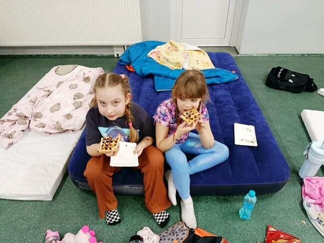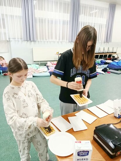 Podczas nocowanki dzieci miały okazję spędzić czas w radosnej i bezpiecznej atmosferze. W programie znalazły się wspólne zabawy, tańce oraz rozmowy integracyjne, które sprzyjały budowaniu relacji i wzmacnianiu więzi koleżeńskich. Nie zabrakło także wspólnego oglądania filmu, co stało się doskonałą okazją do odpoczynku po pełnym wrażeń dniu. Ogromną niespodzianką dla uczestników był słodki poczęstunek przekazany przez Sołtysa oraz Radę Sołecką wsi Dębowo, za który organizatorzy oraz dzieci składają serdeczne podziękowania. Dodatkowo panie z Centrum Kształcenia i Filii Bibliotecznej przygotowały dla dzieci pyszne, świeżo wypiekane gofry, które cieszyły się dużym zainteresowaniem i szybko znikały z talerzy. Zajęcia feryjne w świetlicy wiejskiej były doskonałą okazją do aktywnego i twórczego spędzenia wolnego czasu. Wspólna nocowanka przyniosła dzieciom wiele radości, uśmiechu oraz pozytywnych emocji, a także stała się pięknym przykładem integracji lokalnej społeczności.