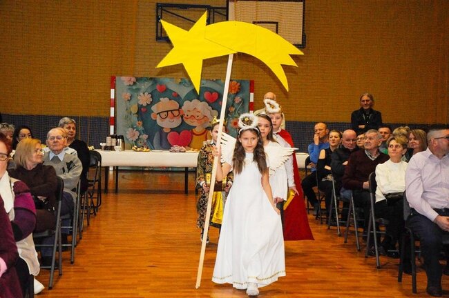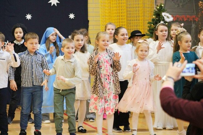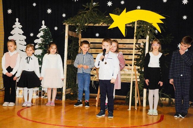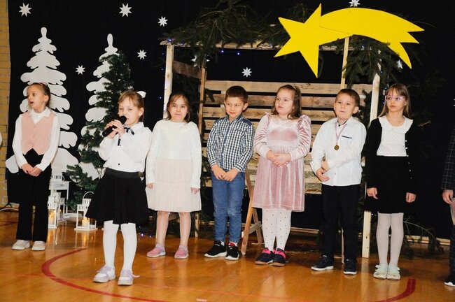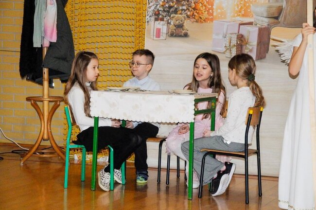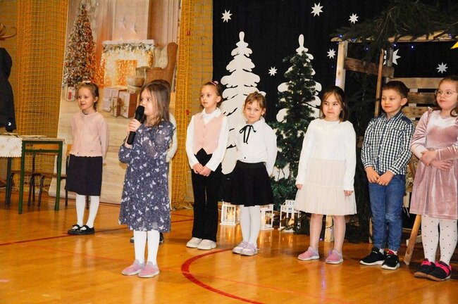 Następnie uczniowie klasy drugiej i trzeciej zaprezentowali jasełka, które w niezwykle ciekawy sposób łączyły świat współczesny ze scenami rozgrywającymi się w stajence przy małym Jezusie. Przedstawienie zachwyciło widzów zarówno treścią, jak i zaangażowaniem młodych aktorów.