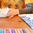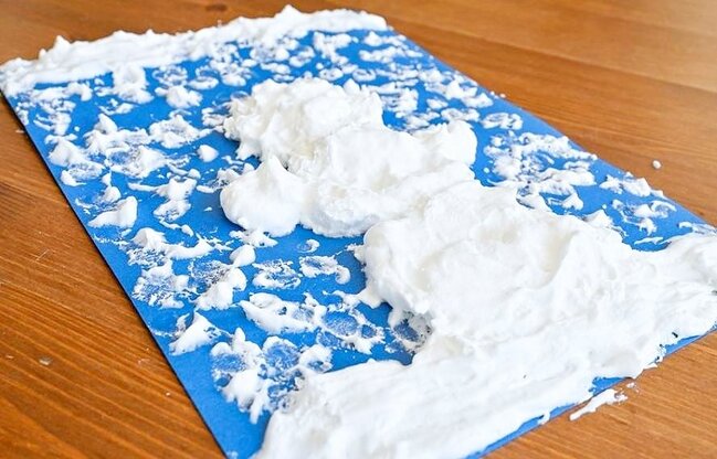 Do wykonania pracy potrzebujesz: piankę do golenia, klej introligatorski np. magic, kartkę z niebieskim i czarnym tłem, aby lepiej kontrastowało z piankowym rysunkiem, plastelinę, miseczkę.