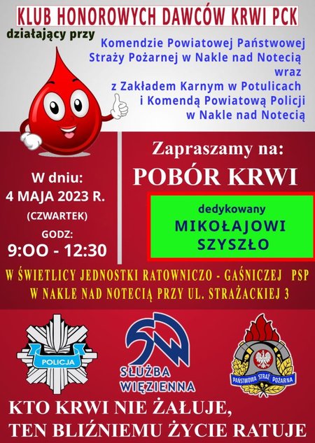 Wszystkich honorowych krwiodawców oraz osoby chętne, by krwiodawcami się stać, zapraszamy 4 maja 2023 roku świetlicy Jednostki Ratowniczo-Gaśniczej w Nakle nad Notecią w Nakle nad Notecią przy ul. Strażackiej 3, w godzinach od 9.00 do 12.30. Na krwiodawców oczekiwać będzie zespół z Wojskowego Centrum Krwiodawstwa i Krwiolecznictwa w Bydgoszczy.