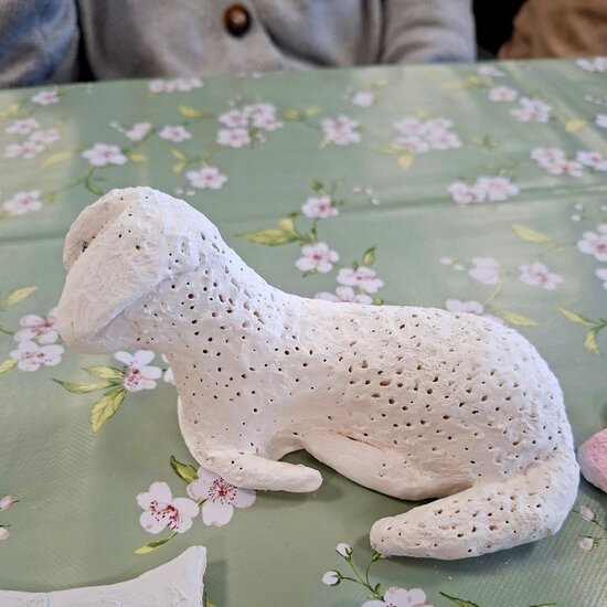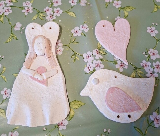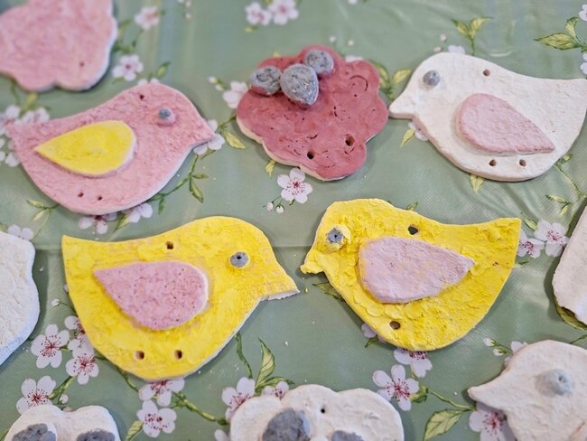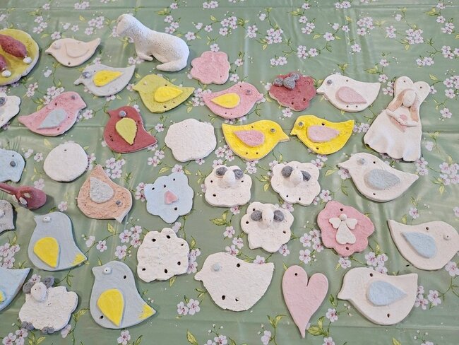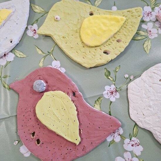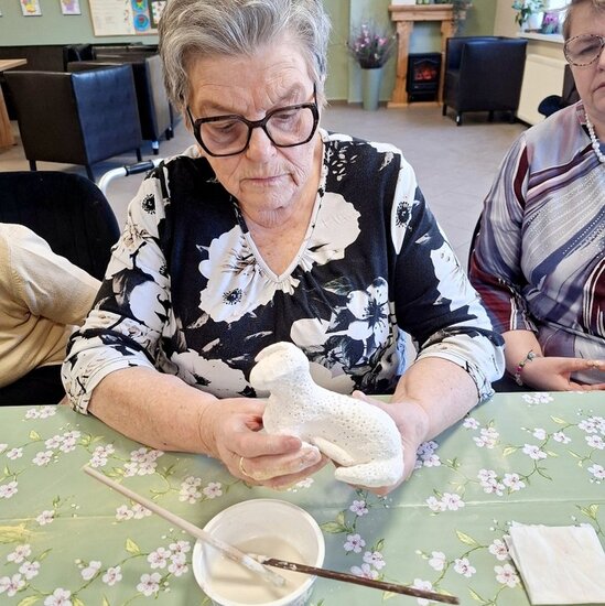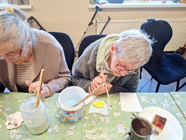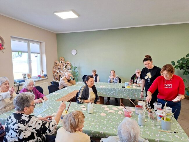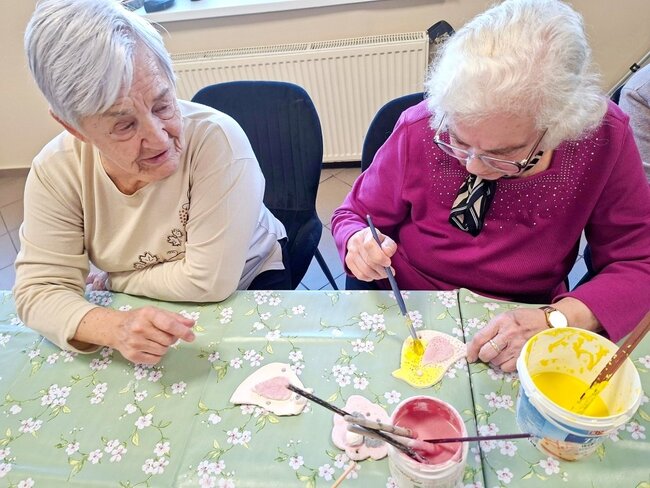 Podczas poprzednich zajęć seniorzy  z ogromnym zaangażowaniem i kreatywnością lepili swoje prace z gliny. Powstały wtedy piękne ptaszki, aniołki, serduszka oraz baranki. Po pierwszym wypale na biskwit przyszedł czas na nadanie im kolorów i charakteru. Po krótkim instruktażu każdy z ogromną dokładnością malował swoje prace. Ten etap zawsze budzi wiele emocji i ciekawości, ponieważ dopiero po kolejnym wypale zobaczymy prawdziwy efekt .