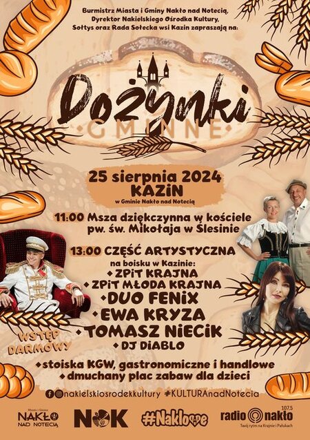Świętowanie rozpoczniemy mszą dziękczynną, która o godz. 11:00 odprawiona zostanie w kościele pw. św. Mikołaja w Ślesinie. Później o godz. 13:00 spotykamy się w Kazinie, by uformować orszak, który przejdzie na tamtejsze boisko. To tam odbywać się będzie artystyczna część tegorocznych Dożynek, która rozpocznie się od przekazania chleba na ręce burmistrza przez starostów dożynkowych. Następnie obrzęd chleba oraz występ wypełniony folklorem zaprezentuje Zespół Pieśni i Tańca Krajna (Stowarzyszenie Krajna / ZPiT Krajna). Po przemówieniach zaprezentuje się Zespół Pieśni i Tańca "Młoda Krajna". Później na scenie pojawi się znany fanom śląskich szlagierów zespół Duo Fenix - Dwa Fyniki. Krystyna Dubik i Waldemar Kołaczyk od 1993 roku wydali 10 płyt, z których pochodzą różne przeboje, w tym także ten, który cieszy się największą popularnością "Życzymy szczęścia". Kolejną artystką będzie Ewa Kryza znana m.in. z programu "Rolnik Szuka Żony", uczestniczka "Szansy na sukces". Wokalistka niedawno wróciła do tworzenia autorskich singli. Ostatni z nich to utwór "Szanse", który z pewnością znajdzie się w setliście dożynkowego koncertu. Po chwilowej pauzie w postaci wręczenia dyplomów dla sołectw, które wykonają wieńce dożynkowe, scenę przejmie Król Disco, czyli Tomasz Niecik. Każdy z Was choć raz (choćby przypadkiem) słyszał największy hit naszej gwiazdy dożynek "Cztery Osiemnastki". A przebojów, które na YouTube wykręciły milionowe wyświetlenia jest znacznie więcej i z pewnością porwą Was one do zabawy. Gdyby tego było mało to na koniec Sołectwo Kazin zadbało o muzyczną dokładkę, którą zaserwuje DJ Diablo.