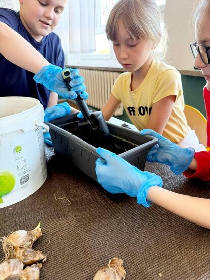 Uczniowie klasy 3a, realizując innowację #pedagogiczną z zakresu edukacji przyrodniczej, wzięli udział w zajęciach polegających na sadzeniu żonkili.