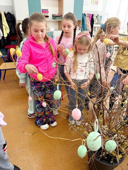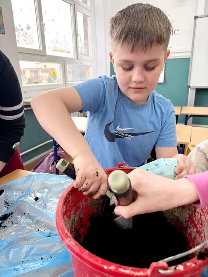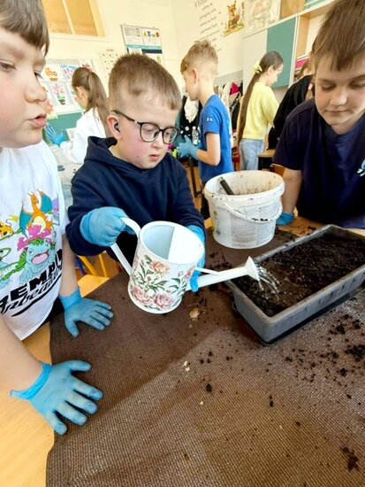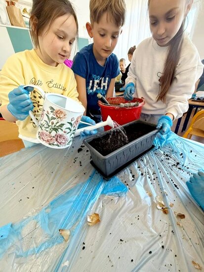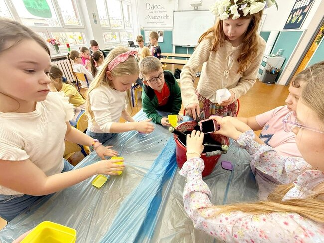 Podczas pracy uczniowie działali w kilkuosobowych grupach, dzięki czemu mogli wspólnie planować działania, dzielić się zadaniami oraz wzajemnie sobie pomagać. Współpraca sprzyjała rozwijaniu umiejętności komunikacji, odpowiedzialności za wspólną pracę oraz budowaniu pozytywnych relacji w zespole. Zajęcia te są częścią bloku tematycznego innowacji pedagogicznej, który poświęcony jest zwiastunom wiosny. Uczniowie poznają pierwsze oznaki nadchodzącej pory roku oraz obserwują zmiany zachodzące w przyrodzie. Sadzenie żonkili pozwoliło dzieciom w praktyczny sposób poznać proces wzrostu roślin oraz nauczyć się podstawowej pielęgnacji roślin cebulowych. Dodatkowo wzbogaciliśmy kącik przyrodniczy o rzeżuchę. Dzieci przygotowały przepiękną dekorację do sali lekcyjnej wykorzystując gałązki, bazie kotki oraz kolorowe jajka.