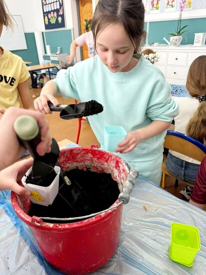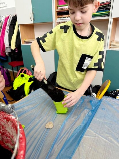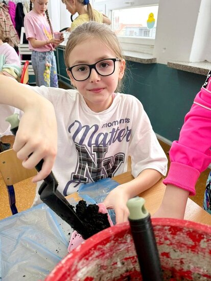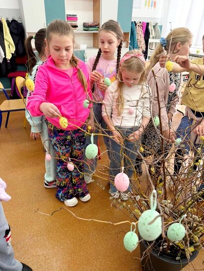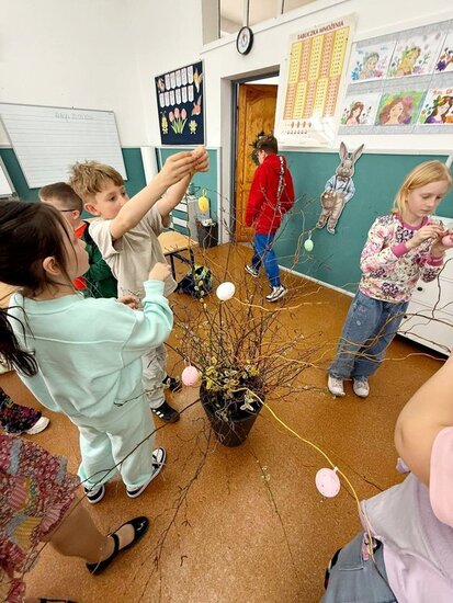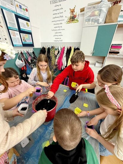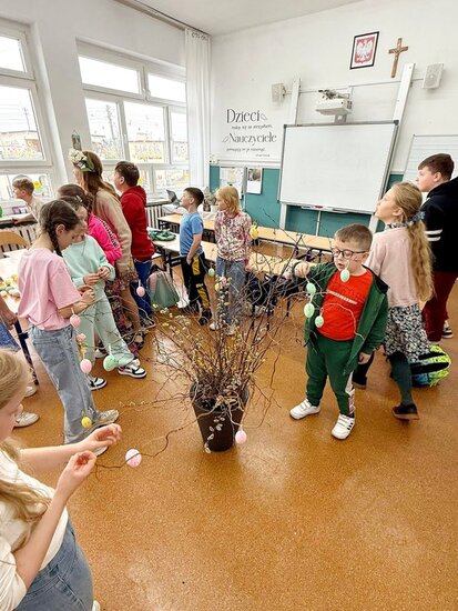 Uczniowie samodzielnie zasadzili już żonkile, obserwując ich wzrost i rozwój, a dziś wzbogacili klasowy kącik przyrodniczy o rzeżuchę. Dzięki temu mogą na bieżąco śledzić zmiany zachodzące w przyrodzie oraz uczyć się odpowiedzialności za rośliny. Dodatkowo dzieci przygotowały piękną dekorację do sali lekcyjnej, wykorzystując bazie kotki, gałązki oraz kolorowe jajka. Wspólna praca nad wystrojem klasy nie tylko rozwija ich kreatywność, ale także wprowadza radosny, wiosenny nastrój.