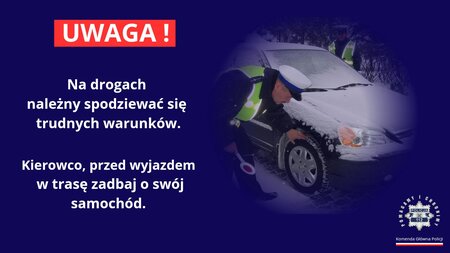 Kierowco, przed wyjazdem w trasę zadbaj o dokładne odśnieżenie samochodu, dostosuj prędkość do warunków drogowych.