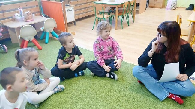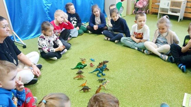 Dzień Dinozaura okazał się idealnym pretekstem do przeprowadzenia zajęć. Podczas rozmowy dzieci wykazały się bardzo dużą wiedzą. Chętnie odpowiadały na pytania, a nawet dodawały sporo informacji od siebie.