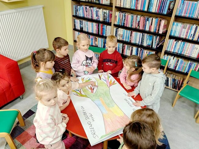 Rozmawialiśmy o zaletach pozytywnego myślenia oraz optymistycznego spojrzenia na każdy dzień. Dzieci wysłuchały bajeczki o trzech małych sówkach, które postanowiły poszukać Krainy Radości, przesyłały sobie iskierkę dobroci, mówiły co im sprawia radość. Małe Sówki wykonały też taniec radości, bawiły się w lustrzane odbicie, przystroiły drzewo dobrych myśli oraz wybrały dla bliskich karteczki z dobrym słowem. Na zakończenie dzieci otrzymały zakładki, z ważnym przesłaniem: „Ciesz się z drobnych rzeczy”. To było spotkanie pełne uśmiechu.