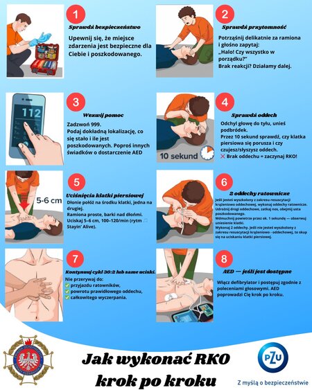 - Nie przerywaj działań do czasu przyjazdu służb lub powrotu oddechu.
