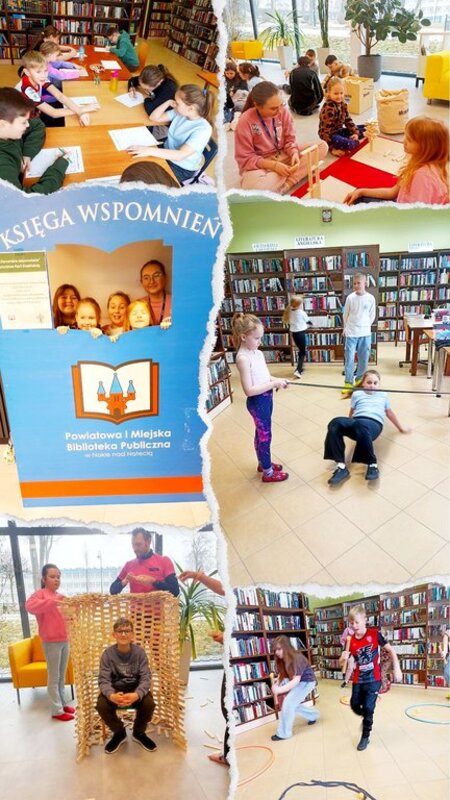 Rozpoczęliśmy od zajęć integracyjnych, które pozwalały uczestnikom lepiej się poznać. Dzieci brały udział w grach zespołowych, wyzwaniach sprawnościowych oraz ćwiczeniach ruchowych. Feriowicze mogli również rozwijać swoje talenty plastyczne. Dużo emocji wzbudziły konkurencje sportowe i taneczne. W czwartek udaliśmy się do biblioteki dziecięcej w Nakle aby wziąć udział w warsztatach przygotowanych przez animatorów z „Cudosfery” z drewnianymi klockami w roli głównej. W programie znalazł się także konkurs „Mam talent”, w trakcie którego młodzi artyści z dumą prezentowali swoje zdolności. Był taniec, śpiew i sportowe popisy. Wszyscy chętnie angażowali się w proponowane aktywności wykazując się energią, kreatywnością i świetna współpracą. Ferie pokazały, że biblioteka może być przestrzenią pełną ruchu, radości i integracji.