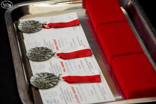 Rocznica zdobycia miasta była znakomitą okazją do wyróżnienia osób, które zasłużyły się w ostatnich latach w upowszechnianiu wiedzy, tradycji i osób związanych z powstańczą insurekcją roku 1918-1919. Medal "Wierni Tradycji" to odznaczenie honorowe ustanowione przez Towarzystwo Pamięci Powstania Wielkopolskiego (TPPW) w celu nagradzania osób i instytucji za wybitne zasługi w upowszechnianiu wiedzy i kultywowaniu pamięci o Powstaniu Wielkopolskim 1918/1919, wręczane za krzewienie historii i wartości związanych z tym zrywem. Medal otrzymali członkowie TPPW w Szubinie Alina i Jacek Paszkiewiczowie oraz Dawid Kłodziński ze Stowarzyszenia Kibiców Lecha Poznań. Medale wręczyli prezes oddziału dr Sławomir Łaniecki i wiceprezes Oddziału Mariola Polańską. Prowadzący poinformował zgromadzonych, że w dniu 8 grudnia 2025 roku w Poznaniu w Pałacu Działyńskich podczas corocznej uroczystości wręczenia nagród honorowych ZG TPPW 1918-1919 „Dobosz Powstania Wielkopolskiego” złoty medal „Wierni Tradycji” z rak prezesa ZG naszego Towarzystwa odebrała pani dr Kamila Czechowska – kustosz i dyrektor Muzeum Ziemi Szubińskiej im. Zenona Erdmanna w Szubinie, a medal srebrny pani Agnieszka Tulińska – dyrektor Szkoły Podstawowej im. Powstańców Wielkopolskich w Rynarzewie.