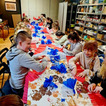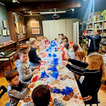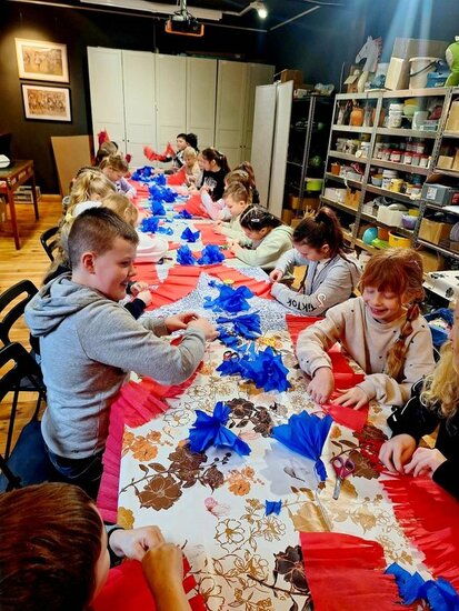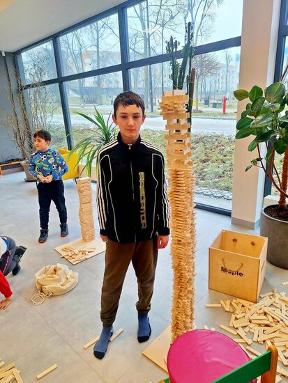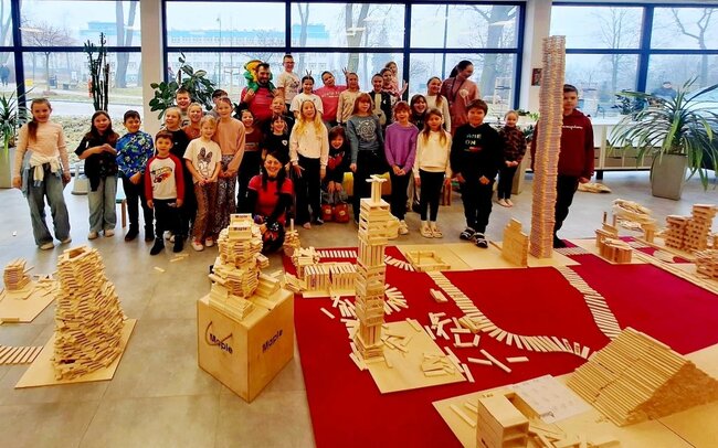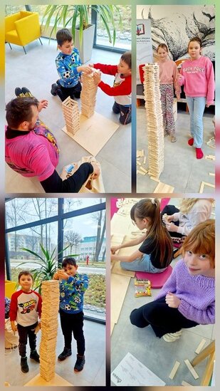 W bibliotece odbywały się również zajęcia kreatywne. Dzieci układały konstrukcje z 10 tysięcy drewnianych klocków, rozwijając wyobraźnię przestrzenną i umiejętność współpracy. Nie zabrakło także spotkania z literaturą. Przygody kota Cukierka zainspirowały uczestników zajęć do warsztatów plastycznych, wykonali oni kolorowe kocie maski, wykazując się pomysłowością i artystycznym talentem.