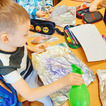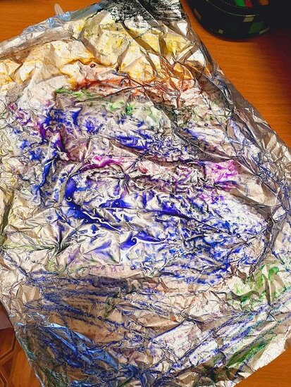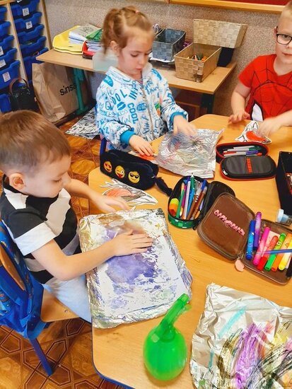 Zajęcia plastyczne w grupie przedszkolnej# Szkoły Podstawowej im. bł. Marii Karłowskiej w Chwaliszewie z wykorzystaniem folii aluminiowej, pisaków i wody.