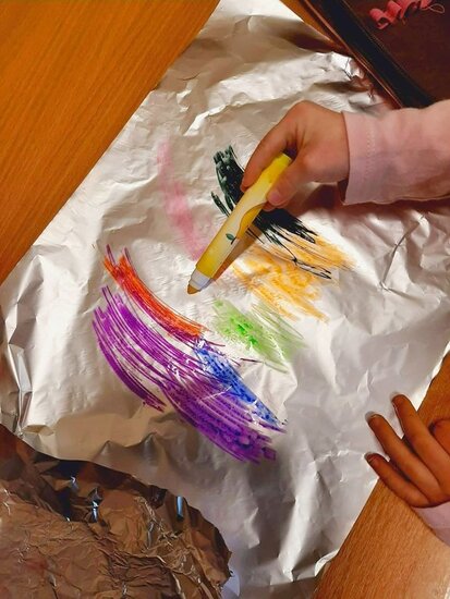 Malowanie na folii to zupełnie inna forma działań plastycznych oraz sensorycznych. Malując na folii dzieci stymulują zmysł dotyku oraz wzroku. Jest to także doskonałe ćwiczenie motoryki małej, koordynacji wzrokowo-ruchowej oraz kreatywności. Zabawa pozwala w pełni rozwijać potencjał twórczy małego artysty.