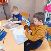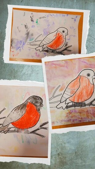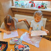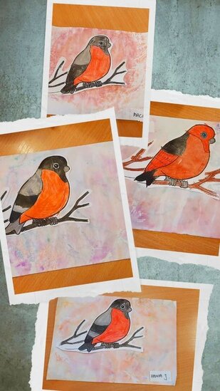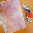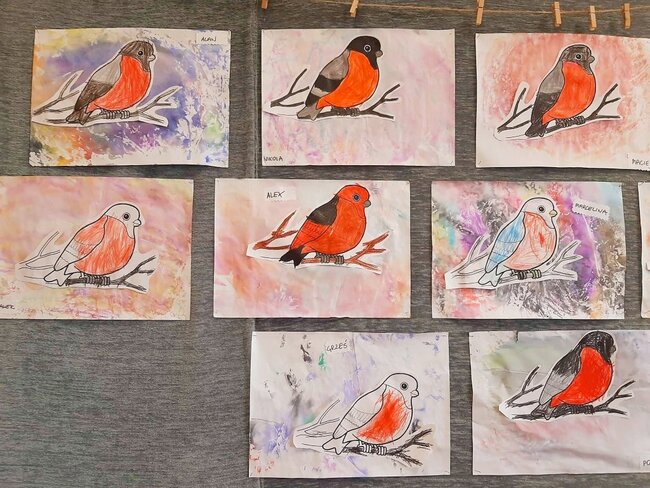 Dzieci rysowały kolorowymi flamastrami na folii, a następnie spryskują wodą, tworzyły rozmyte plamy, które odbijały na białej kartce papieru i ptaszek gotowy.