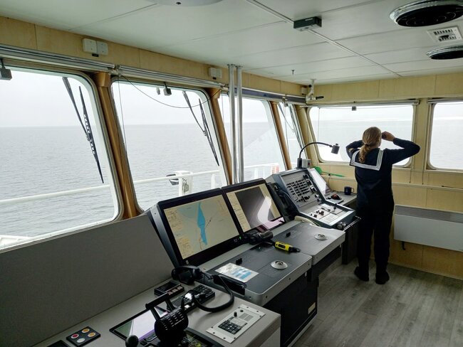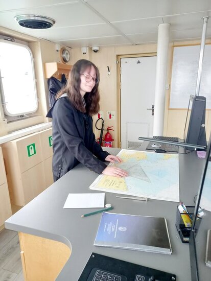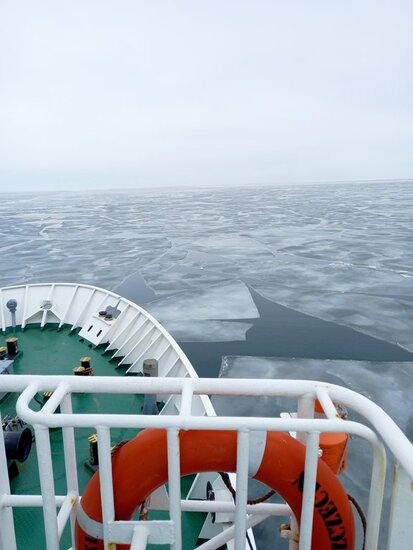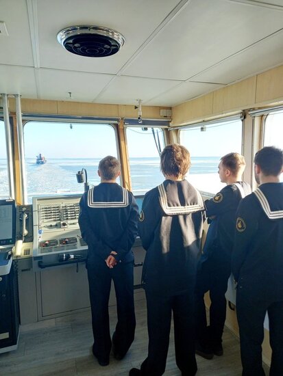 Po czterech godzinach udało nam się przebić z innymi statkami w konwoju na Morze Bałtyckie. Konwój statków to kilka jednostek, które płyną gęsiego, od największego do najmniejszego. Na Bałtyku okazało się, że jest jeszcze sporo lodu. Mieliśmy odwiedzić wyspę Bornholm i port w Kołobrzegu, ale ze względu na duże zlodowacenie zadanie to było niewykonalne. Uczniowie w czasie rejsu mieli okazję manewrować statkiem między krami lodowymi. Lód, który uderzał w poszycie statku, doprowadzał do drgań cały pokład. Mieliśmy wrażenie, że lód cały czas próbuje się przebić do naszych kajut.