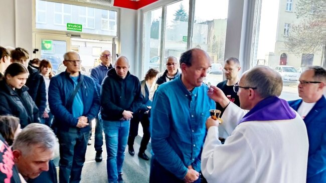 W dniu dzisiejszym na terenie# Solino S.A. odbyła się Msza Święta dla pracowników prowadzących protest głodowy. Eucharystii przewodniczył ks. Robert Różański - proboszcz parafii pw. Św. Trójcy w Górze.