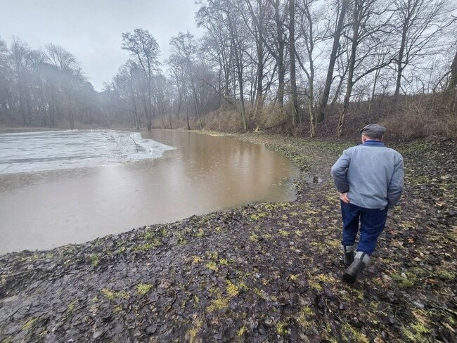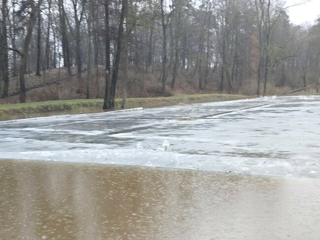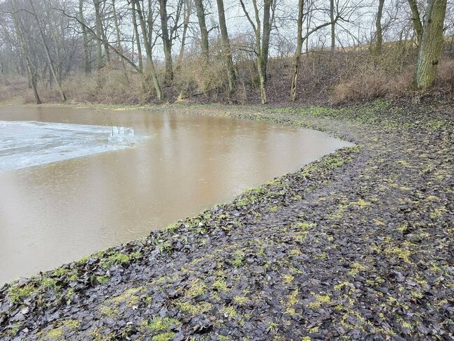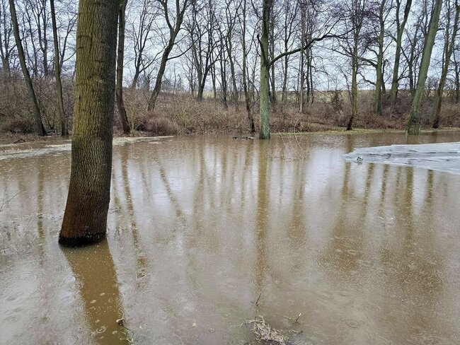 Poziom wody na stawie w# Smogulcu osiągnął nienotowany dotąd poziom. To efekt gwałtownych roztopów i zalegającej pokrywy lodowej.