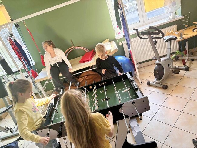 Po występie na uczniów czekał słodki poczęstunek oraz napoje. Mieliśmy również okazję zwiedzić Warsztaty Terapii Zajęciowej i dowiedzieć się więcej o ich codziennym funkcjonowaniu. Największym zainteresowaniem wśród dzieci cieszyła się sala rehabilitacyjna, gdzie mogli zagrać w piłkarzyki, poćwiczyć na sprzęcie sportowym lub zrelaksować się na fotelu masującym.