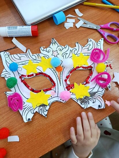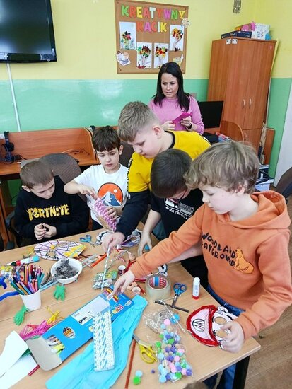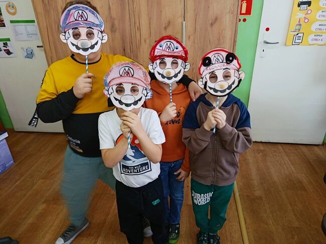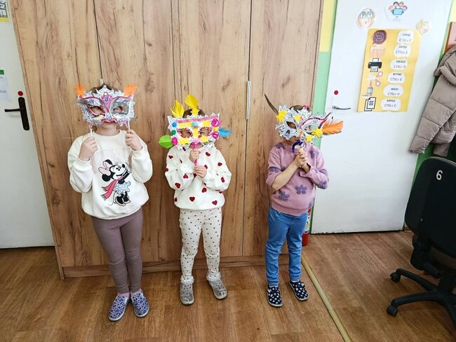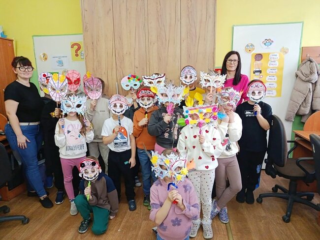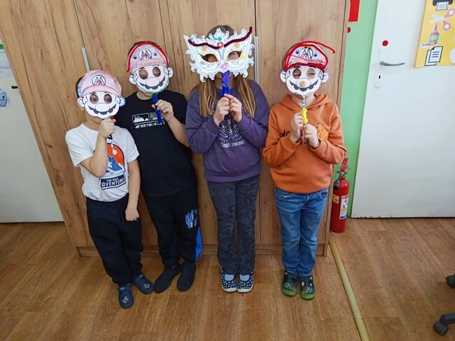 Zajęcia kreatywne były doskonałą okazją do połączenia zabawy z nauką, rozwijania zdolności artystycznych oraz integracji grupy. Uczniowie z dumą prezentowali swoje maski, a spotkanie zakończyło się wspólnym podsumowaniem i rozmową o karnawałowych tradycjach. Powstały maski Supermana, Mario no i oczywiście nie mogło zabraknąć księżniczek.