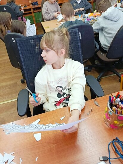 Następnie dzieci przystąpiły do części plastycznej. Z przygotowanych materiałów, takich jak kolorowy papier, krepa, piórka, taśmy cekinowe i wiele innych ozdób, uczniowie wykonali własne maski karnawałowe. Każda praca była niepowtarzalna i odzwierciedlała indywidualną kreatywność autora. Podczas zajęć panowała radosna i twórcza atmosfera.