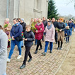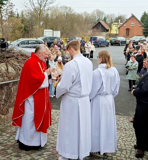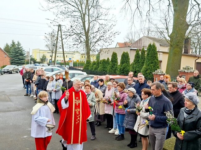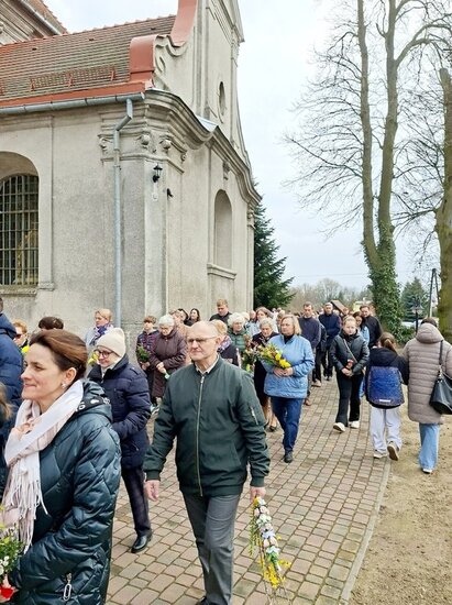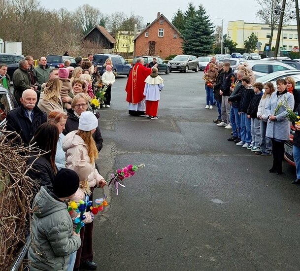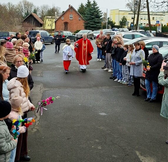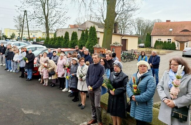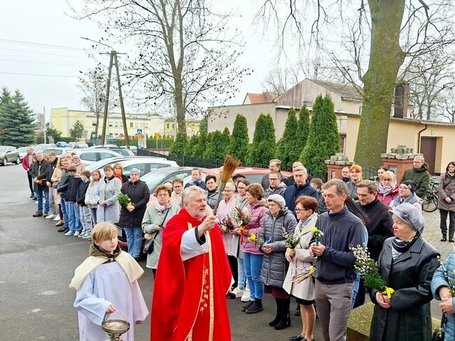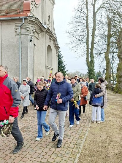 Wierni zgromadzili się przed kościołem. Po krótkiej modlitwie ksiądz proboszcz Witold Korowajczyk poświęcił przyniesione palmy, a następnie ruszyliśmy procesją do kościoła.